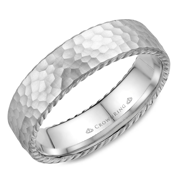 A wedding band with a hammered finish and rope detailing.