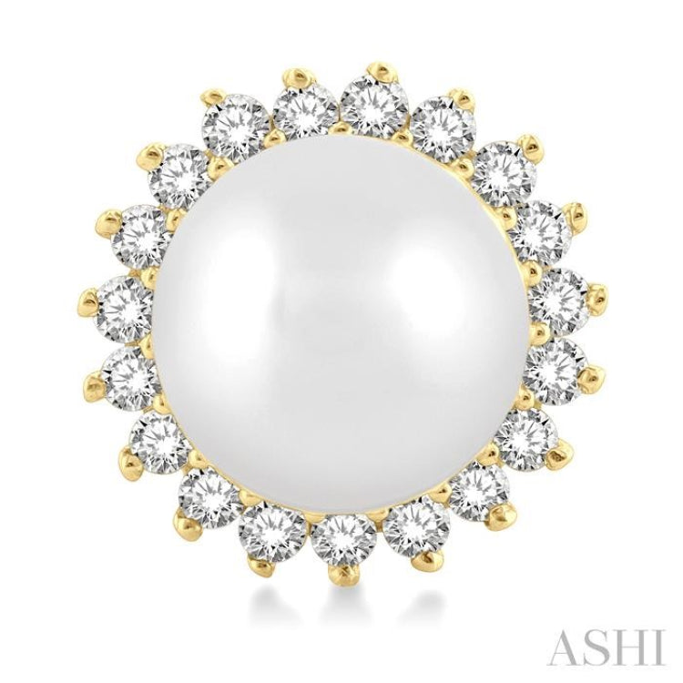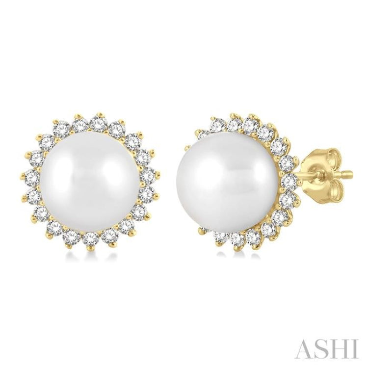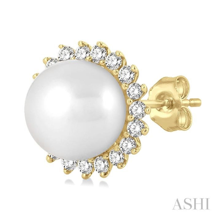 A graceful petite Cultured Pearls and diamond fashion earring, this gives a classy look to any outfit. It is perfect for both semi-casual and formal looks. The earring features a round mount, with a 5.5 MM round Cultured Pearls each in the center, surrounded by round cut diamonds. 19 each prong set round cut diamonds, total 38, encircle either pearl in a petal-like manner, giving the earring a sunflower look. The semi-precious pearl and diamond fashion stud earring is held by a push-back earnut closure and is styled in 10 karat yellow gold. The total diamond weight is 1/6 Ctw.