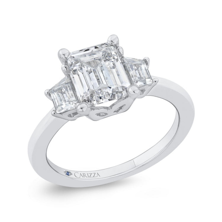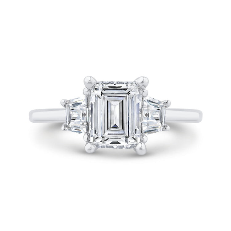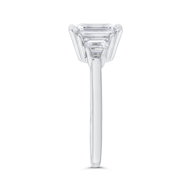 14K White Gold Three Stone Engagement Ring Center Emerald with Trapezoid sides Diamond, Side Stone Shape: Trapezoid, Side Stone Color: LAB GH, Side Stone: 2