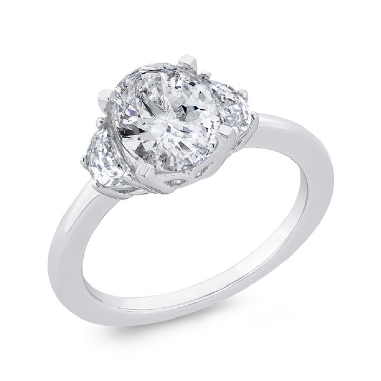 14K White Gold Three Stone Engagement Ring Center Oval with Half-moon sides Diamond, Side Stone Shape: Half moon, Side Stone Color: LAB GH, Side Stone: 2