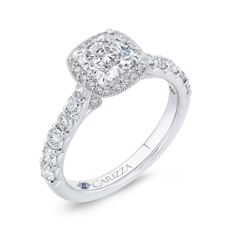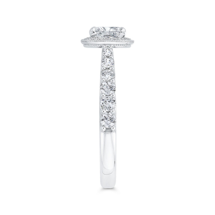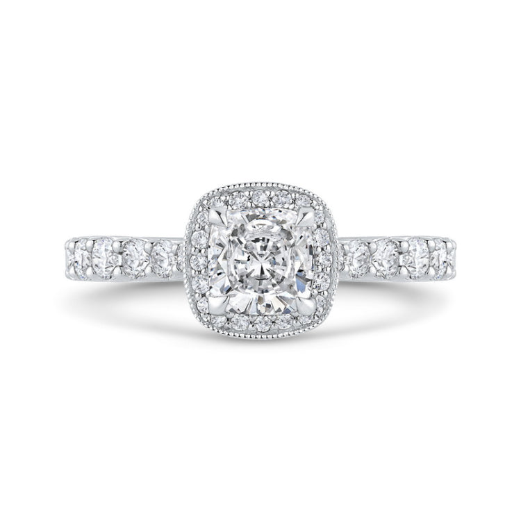 Cushion Cut Diamond Halo Engagement Ring in 14K White Gold (Semi-Mount), Side Stone Shape: Round, Side Stone Color: GH, Side Stone: 41