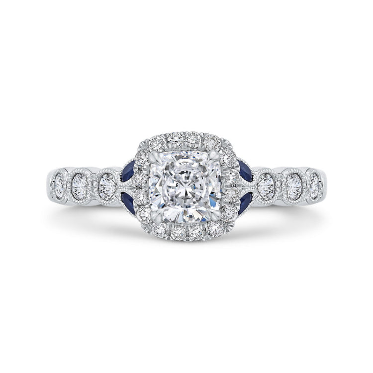 Cushion Cut Diamond Halo Engagement Ring with Sapphire in 14K White Gold (Semi-Mount)
