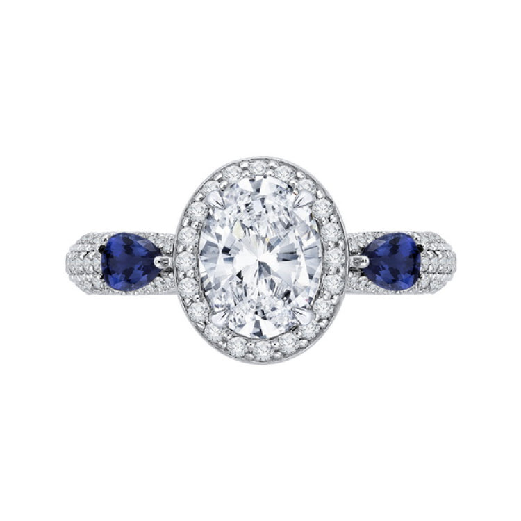 Oval Cut Diamond Halo Engagement Ring with Sapphire in 14K White Gold (Semi-Mount), Side Stone Shape: Round, Side Stone Color: GH, Side Stone: 87