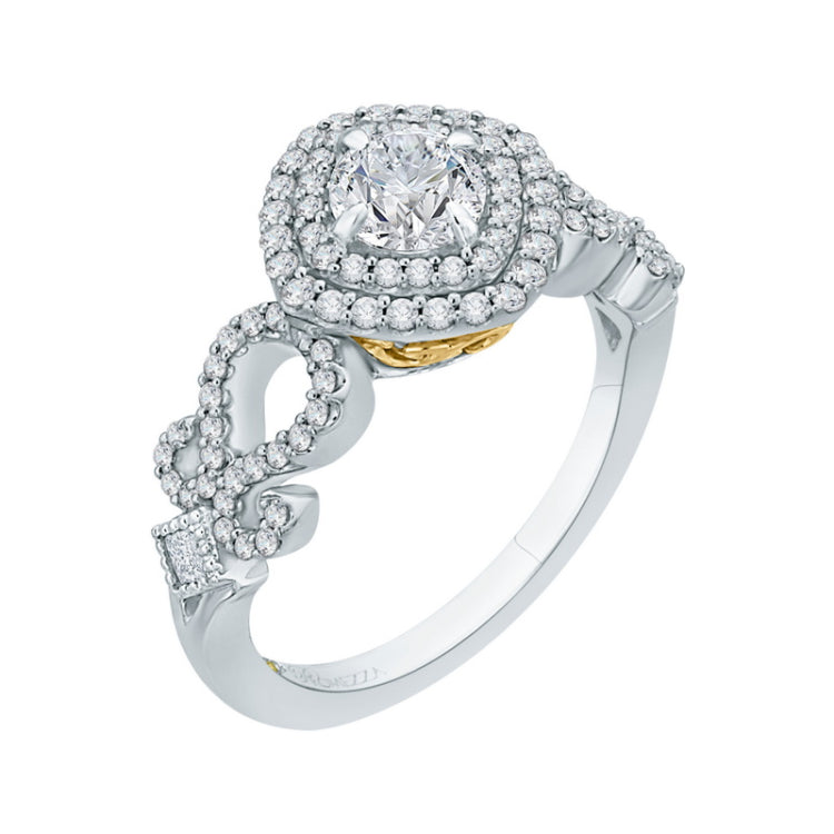 Round Diamond Double Halo Engagement Ring in 14K Two Tone Gold, Side Stone Shape: Round, Side Stone Color: GH, Side Stone: 95
