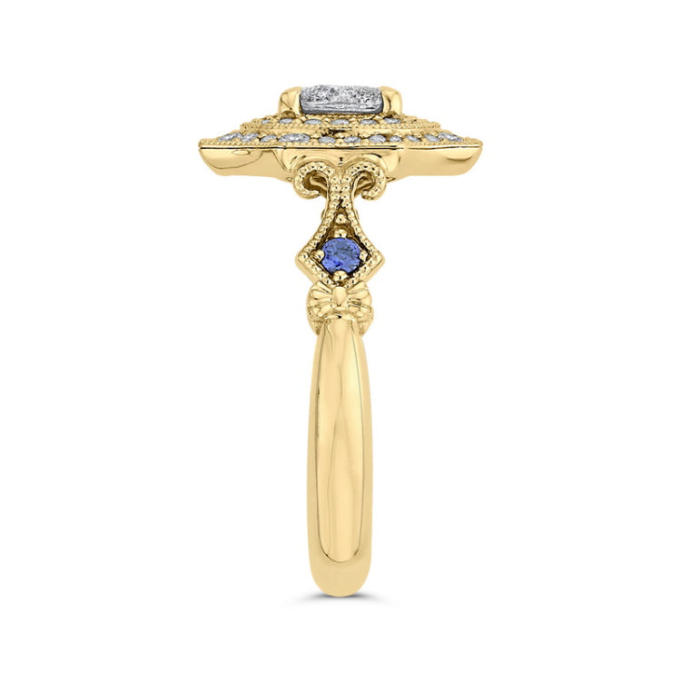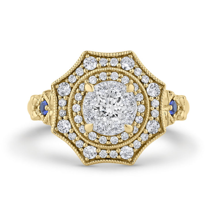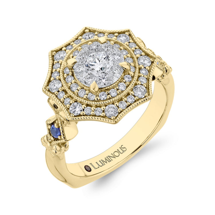 Round Diamond Double Halo Engagement Ring with Blue Sapphire in 14K Two Tone Gold
