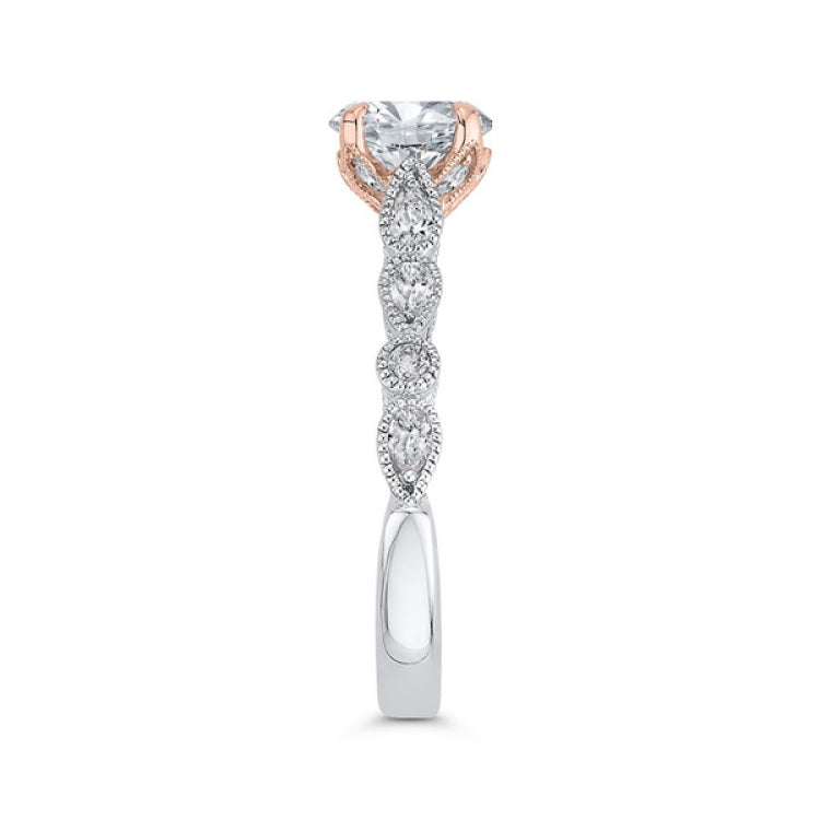 Round Diamond Engagement Ring in 14K Two Tone Gold (Semi-Mount), Side Stone Shape: Round+Marquise+Pear, Side Stone Color: GH, Side Stone: 25