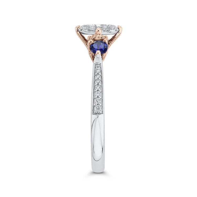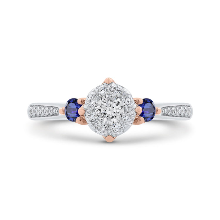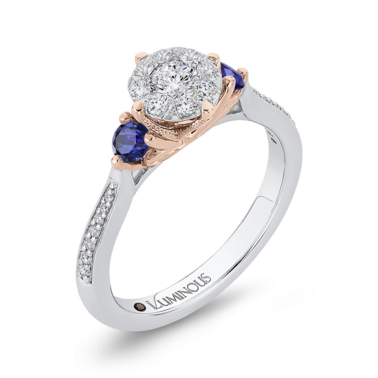 Round Diamond Three-Stone Engagement Ring with Blue Sapphire in 14K Two Tone Gold