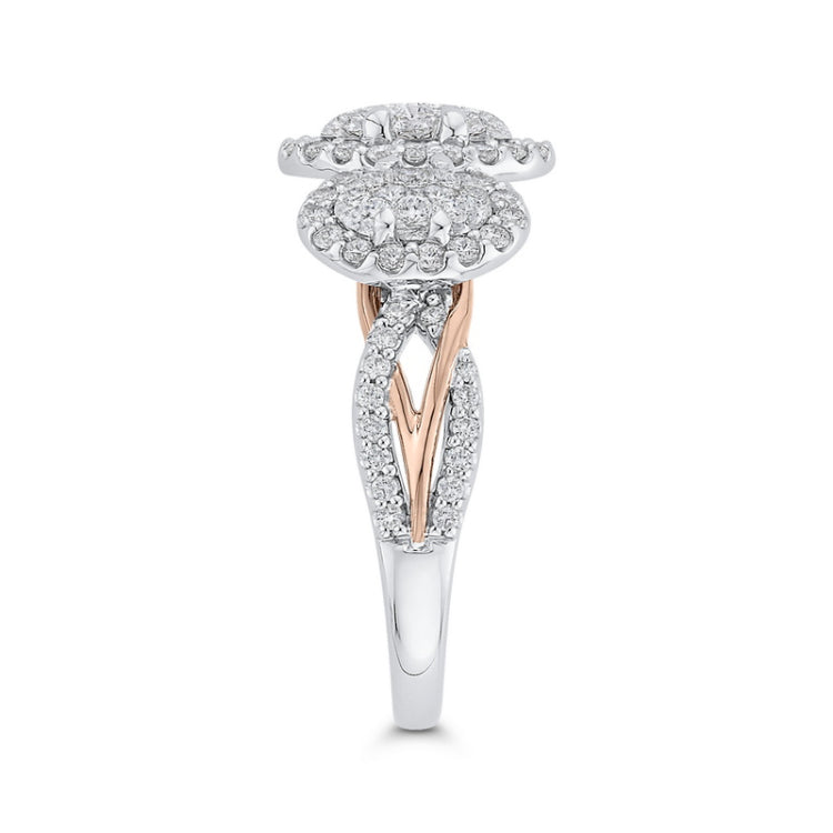 Round Diamond Three-Stone Halo Engagement Ring in 14K Two Tone Gold, Side Stone Shape: Round, Side Stone Color: IJ, Side Stone: 107