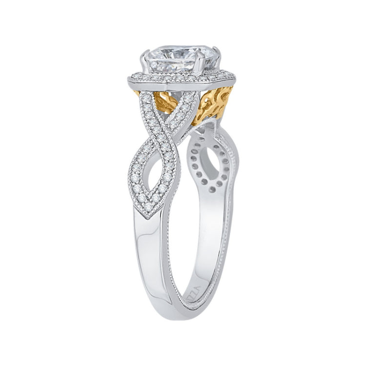 Split Shank Cushion Cut Diamond Halo Engagement Ring in 14K Two Tone Gold (Semi-Mount), Side Stone Shape: Round, Side Stone Color: GH, Side Stone: 71