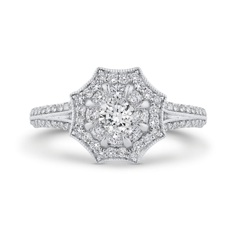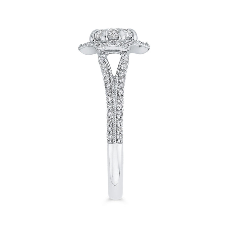 Split Shank Round Diamond Floral Halo Engagement Ring in 14K Two Tone Gold, Side Stone Shape: Round, Side Stone Color: IJ, Side Stone: 82