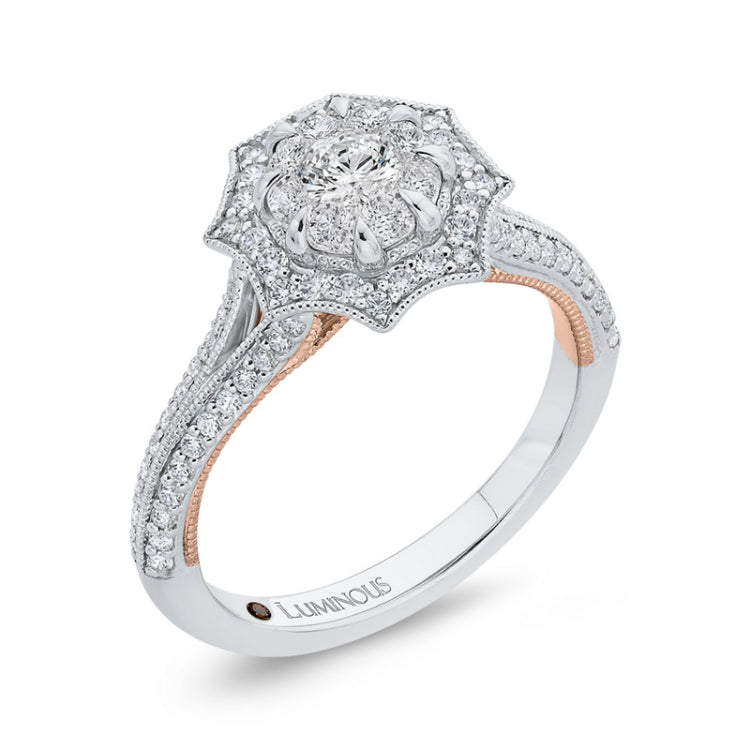 Split Shank Round Diamond Floral Halo Engagement Ring in 14K Two Tone Gold
