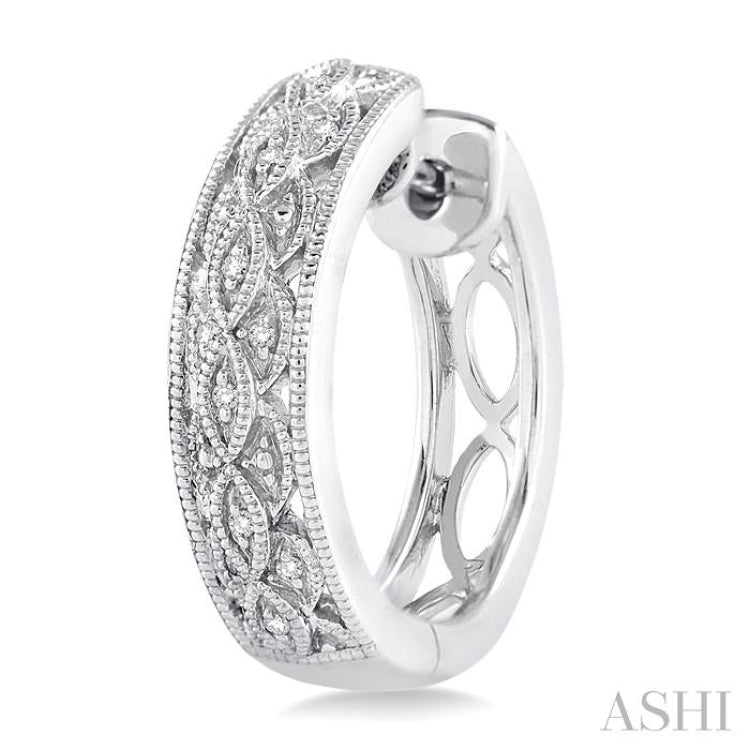 Express your concealed feelings and emotions for her with these stylish diamond earrings. Styled in lustrous sterling silver these milgrain finished earrings showcases curvy rows of 24 single cut diamonds perfectly pave set. These beauties close with secure clasp. The total diamond weight is 1/10 Ctw.