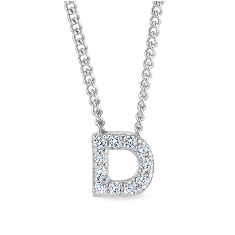 Platinum finish sterling silver micropave d initial pendant with simulated diamonds on 18 curb chain