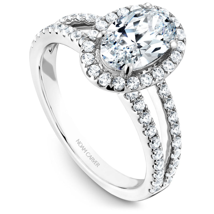 A Noam Carver white gold engagement ring with a halo and a split band encrusted with 74 diamonds.
