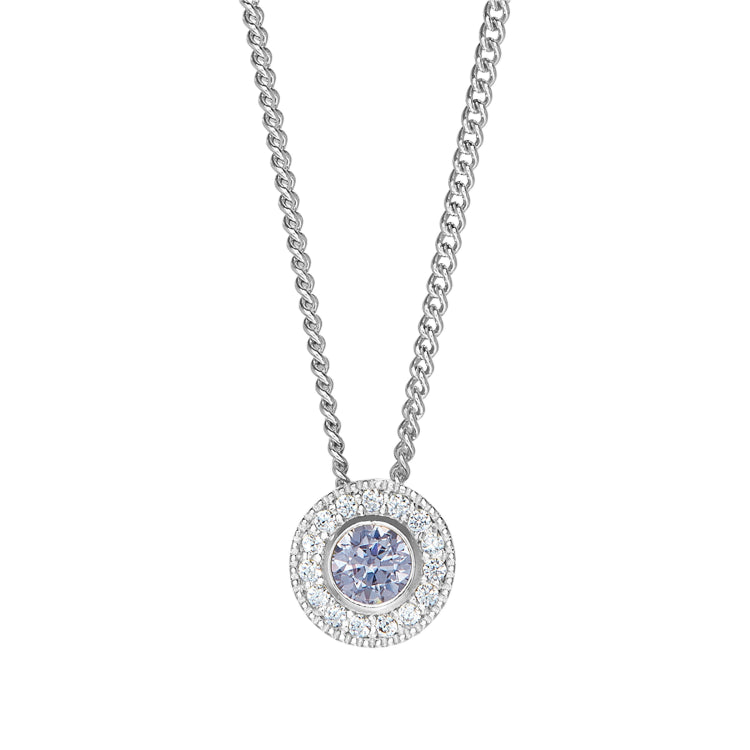 Platinum Finish Sterling Silver Round Simulated Light Amethyst Birth Gem Pendant with Simulated Diamonds on 18" Curb Chain